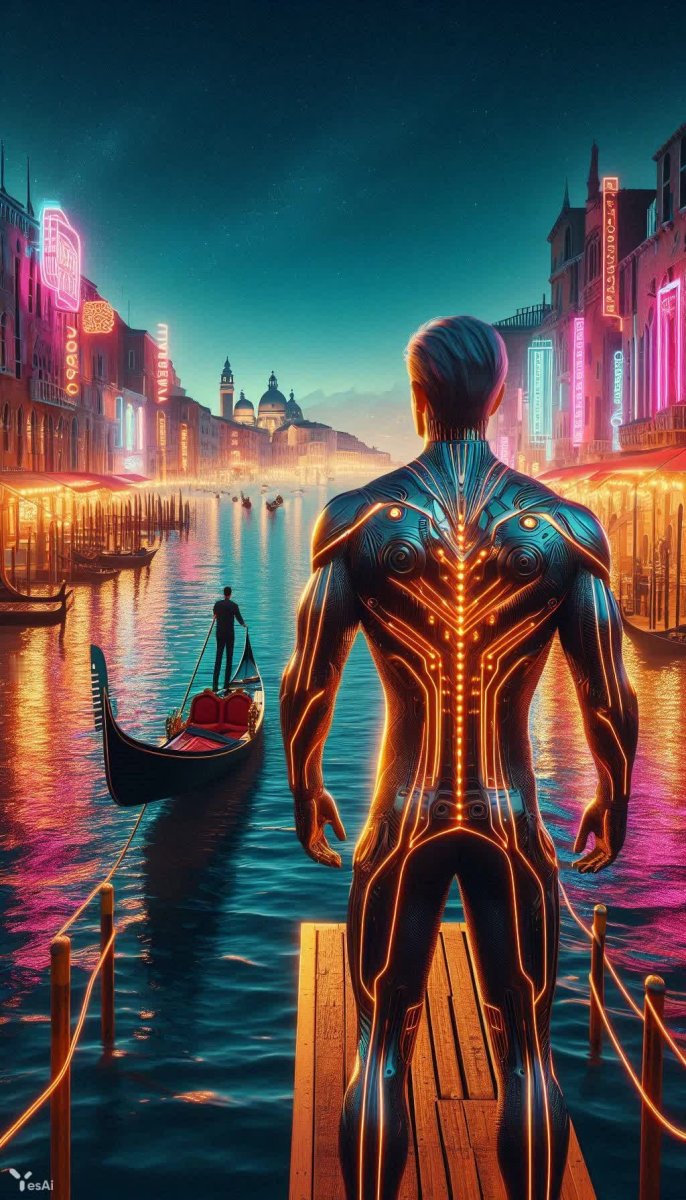 В этом завораживающем изображении будущего мы видим силуэт мужчины, облачённого в футуристический костюм, сочетающий в себе биомоду и бронзовые сплавы. Тонкие, параллельные линии, пронизывающие его одежду, излучают слабое оранжевое свечение, создавая впечатление технологической продвинутости и загадочности. Он стоит на небольшом мосту в неоновом Венеции, откуда открывается захватывающий вид на залив. За спиной героя простирается поразительная панорама: здания украшены яркими неоновыми вывесками, а по водным путям скользят модернизированные гондолы, сочетающие в себе традиционный дизайн и футуристические элементы. Это узнаваемый образ Венеции, преображённый в стиле неонуар, где историческая архитектура переплетается с элементами будущего. На небе едва виднеется линия заката, окрашенная в багряные тона, намекая на приближающуюся ночь. Картина выполнена в смешанной технике акрила и акварели, что придает ей особую глубину и текстуру. Объекты выделены жирным шрифтом курсивом с использованием капиллярных ручек, подчеркивая их значимость и добавляя визуальный интерес. Вся работа пронизана духом неонуар, вдохновлённым творчеством мастера Винсента Сегреллеса, создавая атмосферу таинственности, технологического прогресса и эстетической красоты. Это произведение искусства дарит зрителю возможность заглянуть в мир будущего, где прошлое и настоящее переплетаются в удивительной гармонии
