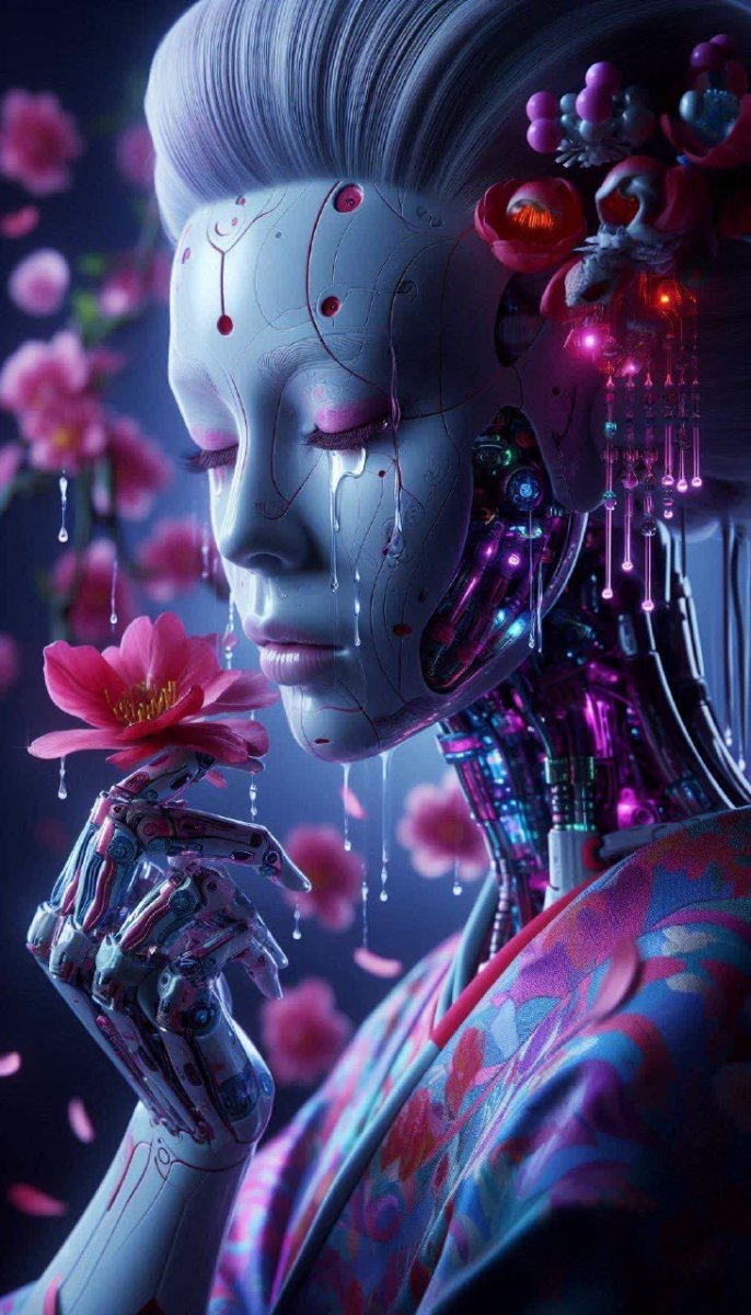 На изображении представлена кибер-гейша, сочетающая в себе элементы традиционного японского искусства и футуристического киберпанка. Её лицо с фарфоровой кожей покрыто капельками ртути, напоминающими слезы, на фоне разлетающихся лепестков сакуры, создающих иллюзию ветра. Использование электрически-розовых и индиго оттенков придает изображению нереальность и мечтательность. Под полупрозрачными слоями биополимера видны сложные микросхемы, подчеркивающие технологическую составляющую образа.