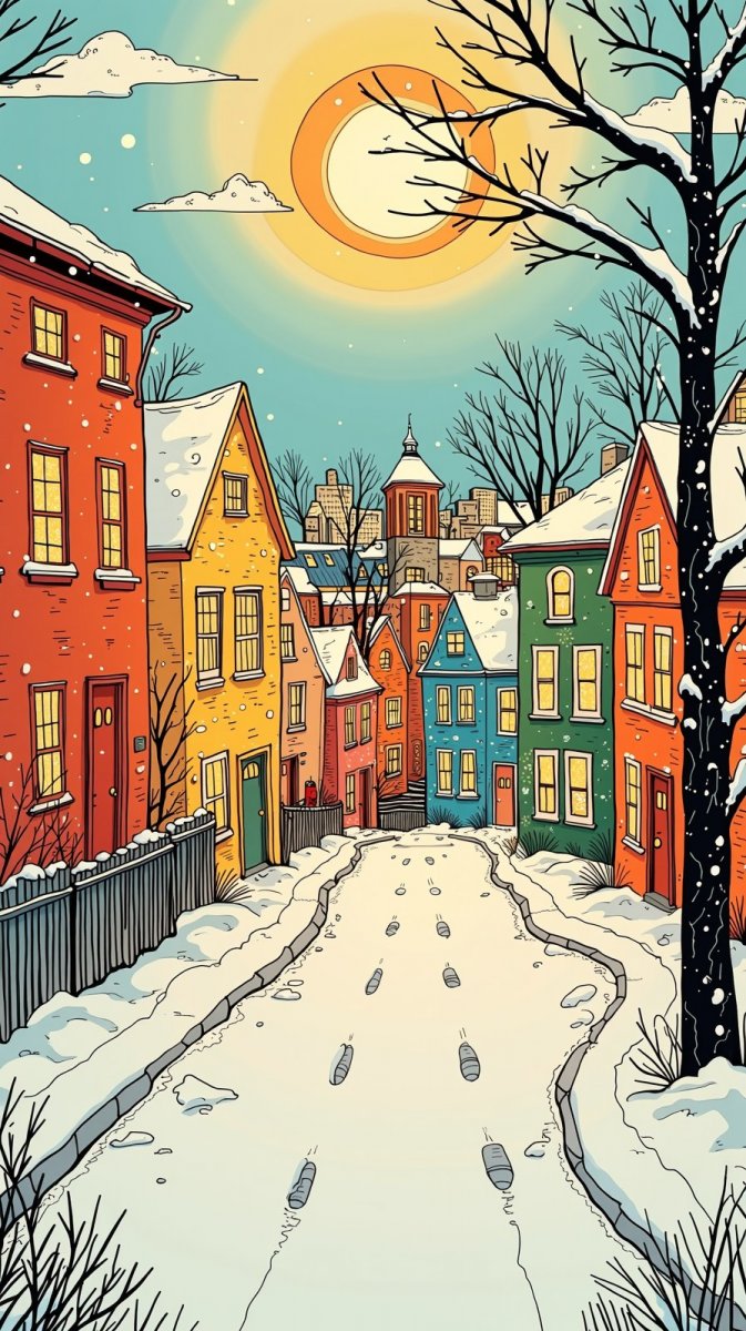 #3. zentangle, illustration portraying an adorable city in winter inspired by maud lewis' vibrant palette, featuring whimsical patterns on windows and cheerful sunrises casting warm hues #role_houses
