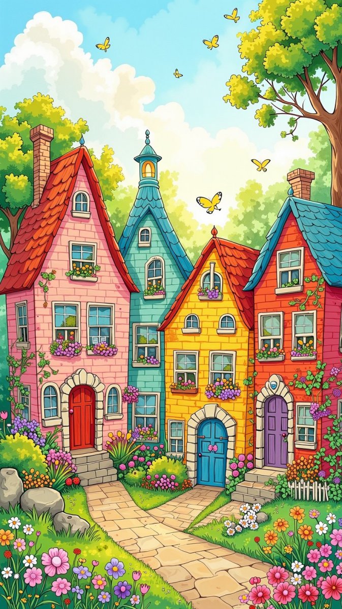 #5. ink drawing, naive art illustration featuring colorful cute houses with flowers, inspired by Thomas Kinkade's vibrant palette, a bright fantasy background with cartoonish elements and warm light #role_houses
