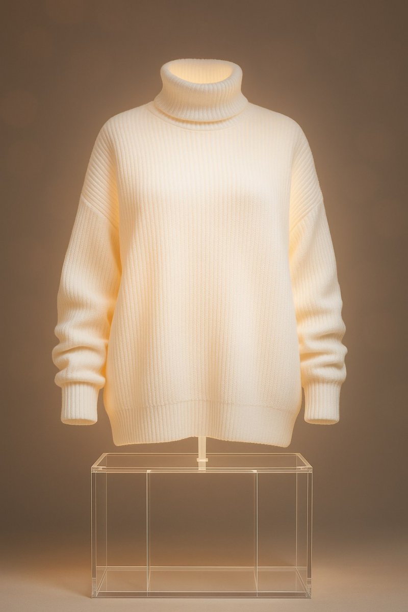 Set this turtleneck sweater onto the stand. A voluminous, loose-fitting, ice-glow-white, ribbed, acrylic, oversized, turtleneck sweater of 68 size with even-knit texture and long cuffed sleeves and hem, the knit pattern of the sweater neck and cuffs is exactly the same as it is on the reference image, slightly translucent fabric. The turtleneck sweater is puffed from the inside so as if inflated with air, and gently illuminated from within, casting a warm soft neon glow, weightless silhouette. It sits on a minimal, transparent acrylic stand with clean lines, in a soft, neutral studio with subtle backlighting, soft-focus bokeh background. High...