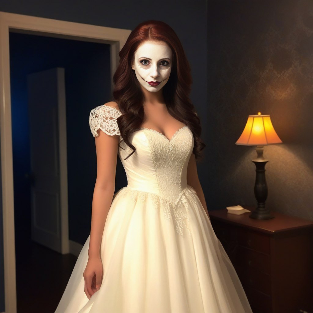 Create a photo using the attached image of the girl's face and appearance, without altering her facial features or overall look. It should be a close-up shot of me taken with a disposable camera at a Halloween party. I’m dancing with Michael Myers — his white mask blank and unfeeling, one hand resting stiffly on my waist. I’m wearing a torn, blood-stained wedding dress — lace, silk, and chaos. The veil is half fallen, my lipstick smeared, eyes distant. The flash from the disposable camera freezes the moment — his knife glinting in the background, my dress catching the light like ghostly fabric. The room behind us is dark and hazy, filled with...