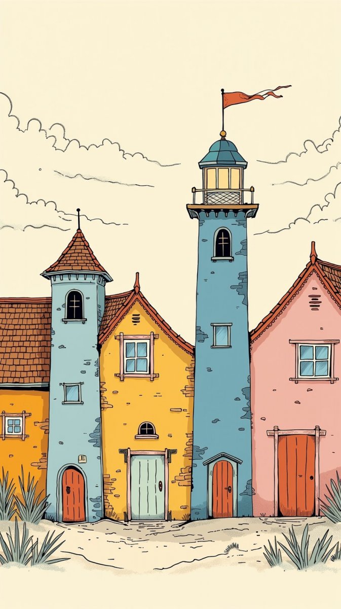 Идиллическая картина в духе наивного искусства и скетчей, запечатлевшая яркие пляжные домики. Архитектурные элементы выделяются причудливыми высокими башнями и аккуратными окошками, выполненными в нежных пастельных тонах. Влияние стиля Томаса Кинкейда ощущается в мягком освещении и общей атмосфере уюта и безмятежности. Четкие черные контуры подчеркивают детализированность изображенных домов, создавая эффект графической четкости на фоне светлого, почти воздушного фона. Картина излучает позитивные эмоции и вызывает чувство радости, напоминая о теплых летних днях, проведенных у моря. Это визуальное воплощение мечты об идеальном прибрежном доме, наполненном светом и счастьем, где каждый элемент декора создает атмосферу гармонии и покоя. Яркие цвета и простота композиции делают эту иллюстрацию привлекательной для широкой аудитории, а ее наивный стиль добавляет ей неповторимого очарования и душевности. В целом, работа представляет собой восхитительную оду красоте природы и человеческому стремлению к созданию уютного и счастливого дома