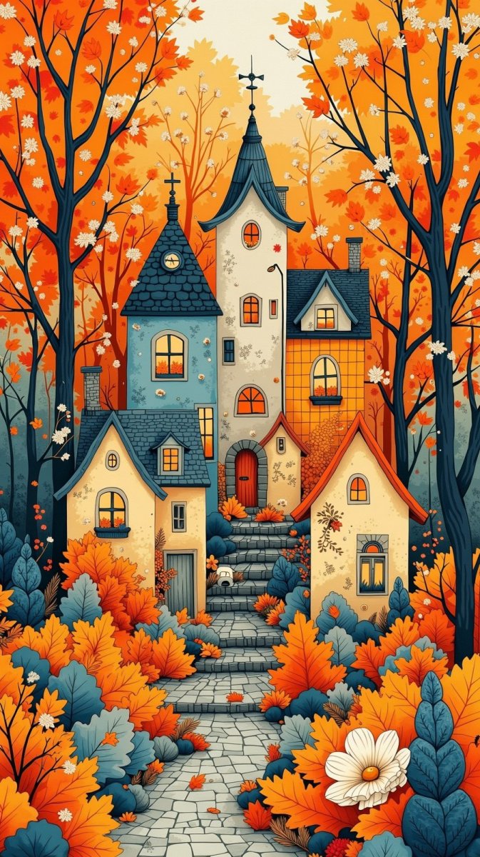 Осенние домики в стиле наивного искусства и вдохновением от Йоханны Басфорд - Пример изображения, сгенерированного нейросетью Flux 1