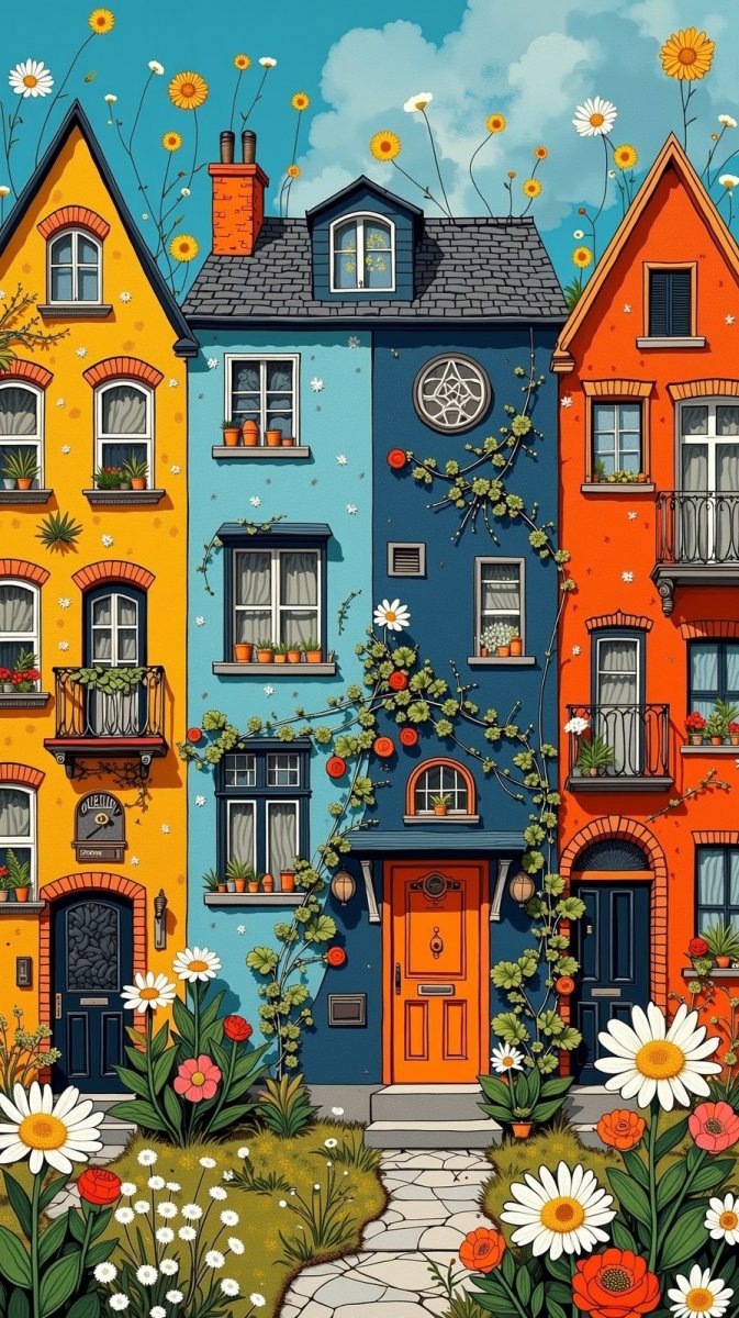 #4. acrylic painting, naive art showing a cartoonish row houses with vibrant camomile and flowers inspired by anna garmashova, rich illustrations, intricate details, fantasy #role_houses