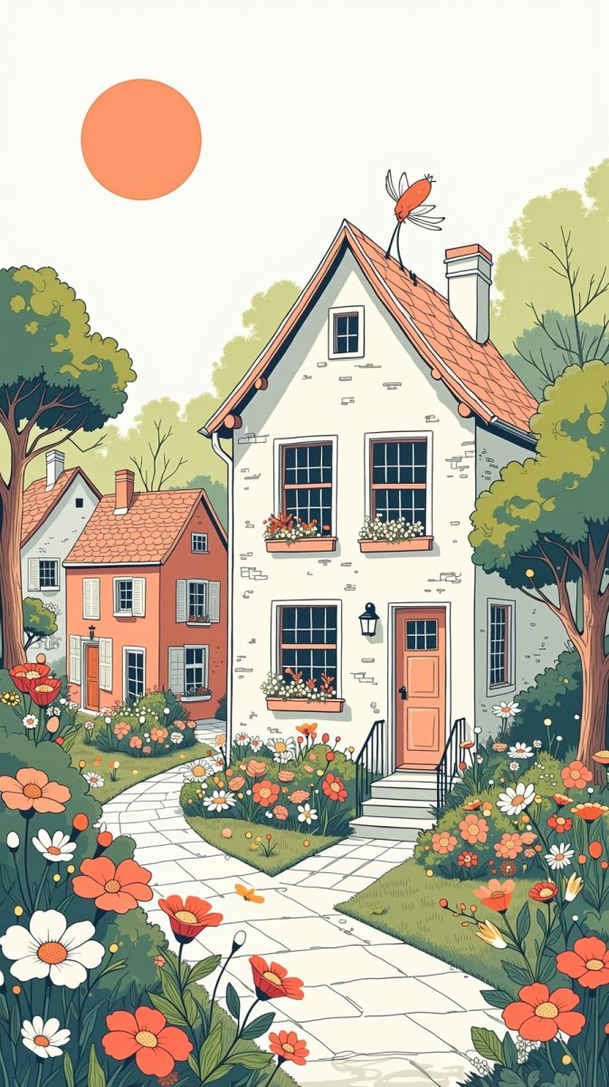 Иллюстрация в мультяшном стиле переносит в уютный уголок коттекорного мира где ряды домиков украшены цветущими балконами и клумбами. Пастельная цветовая гамма навевает весеннее настроение создавая ощущение тепла и спокойствия. Чистый белый фон акцентирует внимание на деталях архитектуры и флоры подчеркивая их нежность и утонченность. Тонкие линии в духе рисунков из журналов или клипартов Джона Янгса придают изображению особую ностальгическую прелесть. Этот визуальный образ воплощает мечту о гармоничном существовании на природе среди красивых домов и пышных цветов. Он идеально подойдет для оформления детских книг открыток приглашений или любых других проектов где требуется добавить капельку очарования и сказочности. Иллюстрация передает атмосферу уюта тепла и безмятежности приглашая зрителя окунуться в мир спокойствия и красоты. Это не просто изображение это целая история о счастливой жизни в окружении природы и любимых вещей. Она словно шепот о весеннем солнце цветущих садах и тихих радостях повседневности. Яркая и позитивная эта иллюстрация станет отличным украшением любого пространства наполняя его светом и вдохновением