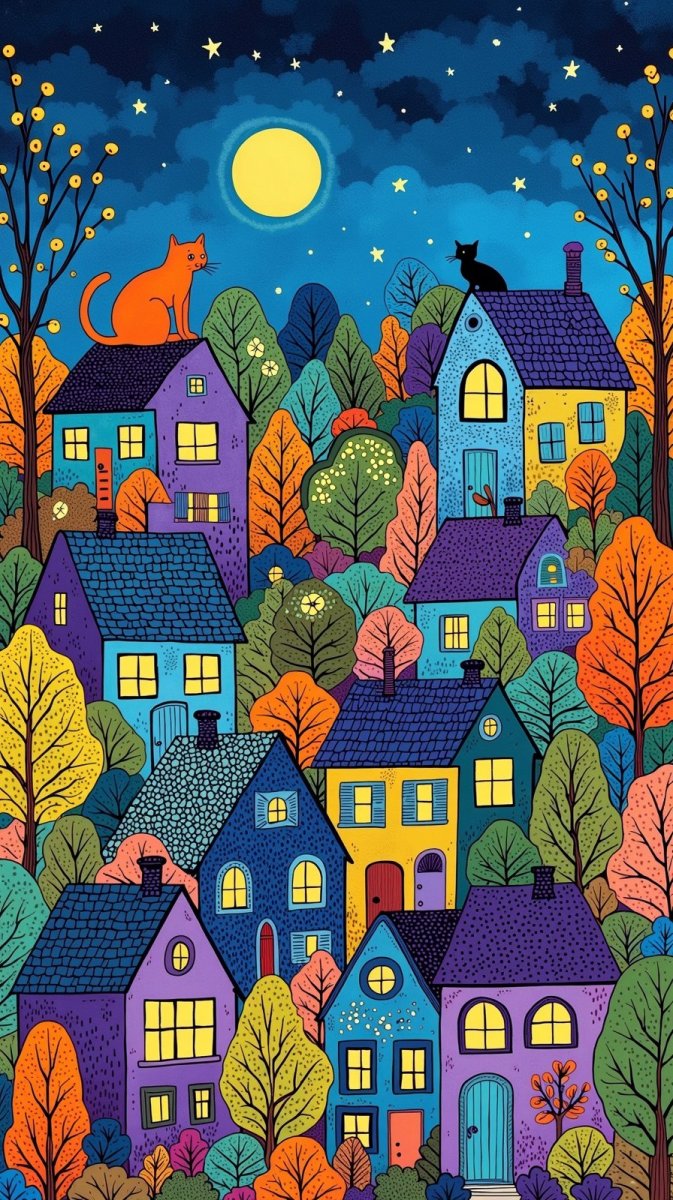 Очаровательная осенняя деревушка, ожившая в технике зентангл и наивной народной живописи. Ночная сцена, полная тепла и уюта, изображает домики, утопающие в ярких красках синего, фиолетового и зеленого. На крышах домов уютно расположился рыжий кот, наблюдая за ночным миром. Рисунок выполнен в простом стиле детского творчества, напоминающем работы Анри Матисса – с его любовью к чистым цветам и упрощенным формам. Эта иллюстрация дарит ощущение спокойствия и гармонии, словно приглашая зрителя окунуться в атмосферу волшебной ночи в маленьком поселке, где царят уют и безмятежность. Детализация выполнена с использованием техники зентангл, что придает работе особую текстуру и глубину. Каждый элемент тщательно проработан, создавая единое целое, которое радует глаз своей простотой и красотой. Эта картина станет прекрасным украшением для детской комнаты или кабинета, напоминая о чудесах осенней природы и тепле домашнего очага. Она словно шепчет сказку о маленьком поселении, где живут добрые люди и пушистые коты, а ночи наполнены тихими радостями и волшебством