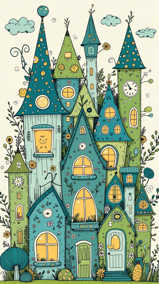 Уютная коллекция рисунков в стиле зентангл, посвященных очаровательным домикам самых разных форм и размеров. Палитра выполнена в нежных оттенках голубого и зеленого, создавая атмосферу спокойствия и гармонии. Каждый дом украшен причудливыми деталями и забавными мотивами, добавляющими картине легкости и игривости. Использование характерных элементов зентангла – повторяющиеся узоры, линии и формы – создает визуально привлекательный и медитативный эффект. Композиция излучает тепло, радость и безмятежность, словно приглашая зрителя окунуться в мир фантазий и уютных мечтаний о собственном доме. Акцент на деталях позволяет рассмотреть множество мелких элементов декора, каждый из которых добавляет индивидуальности и характера каждому домику. Общее впечатление – это жизнерадостное произведение искусства, наполненное позитивом и вдохновением, способное поднять настроение и вызвать улыбку у каждого наблюдателя. Яркое сочетание цветов подчеркивает теплоту и гостеприимство этих волшебных жилищ