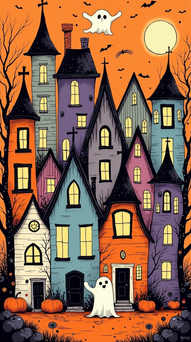 #1. ink drawing, whimsical houses of various shapes in a colorful halloween style, surrounded by playful ghosts and pumpkins, showcasing bold black outlines against a vibrant backdrop #role_houses