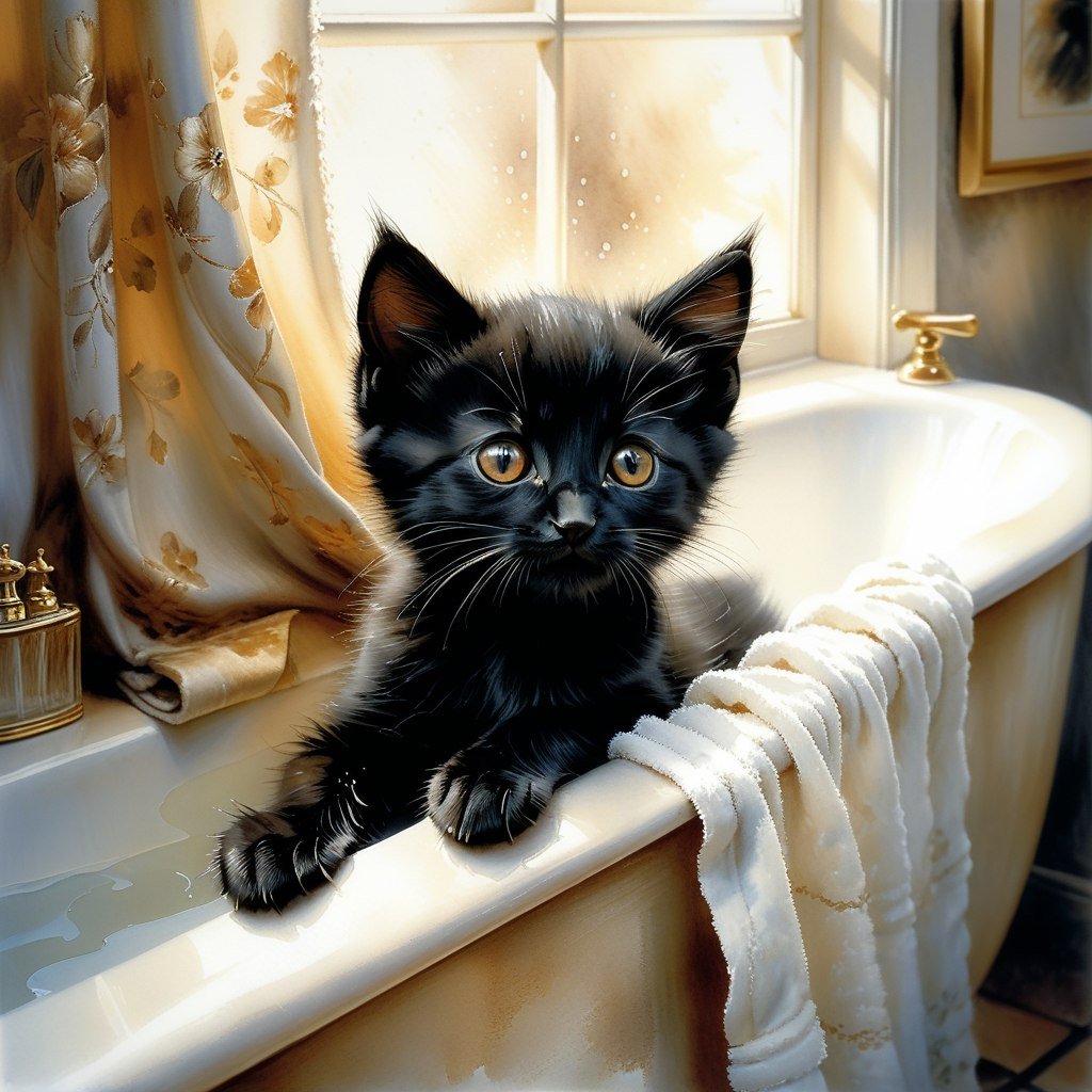 stable diffusion Испуганный котенок в ванной комнате: нежная акварель и деликатный рисунок. Картинка из нейросети Stable Diffusion
