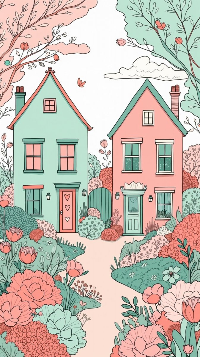 #4. zentagle, playful illustration of pastel-colored houses in spring, showcasing a mint and pink palette intertwined with whimsical garden elements #role_houses