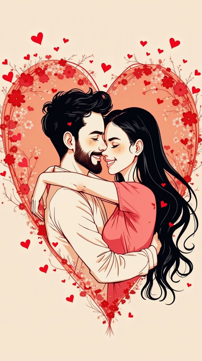 #1 romantic couple in heart-shaped embrace, man with dark hair and beard, girl with long dark hair wearing pink top, both smiling, background filled with red hearts and soft pastel colors, illustration, ink drawing