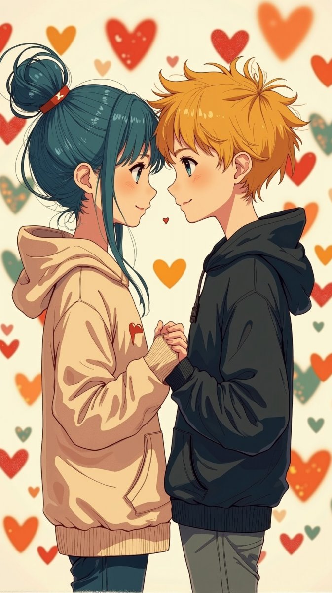 #2 boy and girl holding hands in heart form, girl with blue hair in messy bun, boy in black hoodie, looking lovingly at each other, blurred colorful hearts in background, illustration, ink drawing