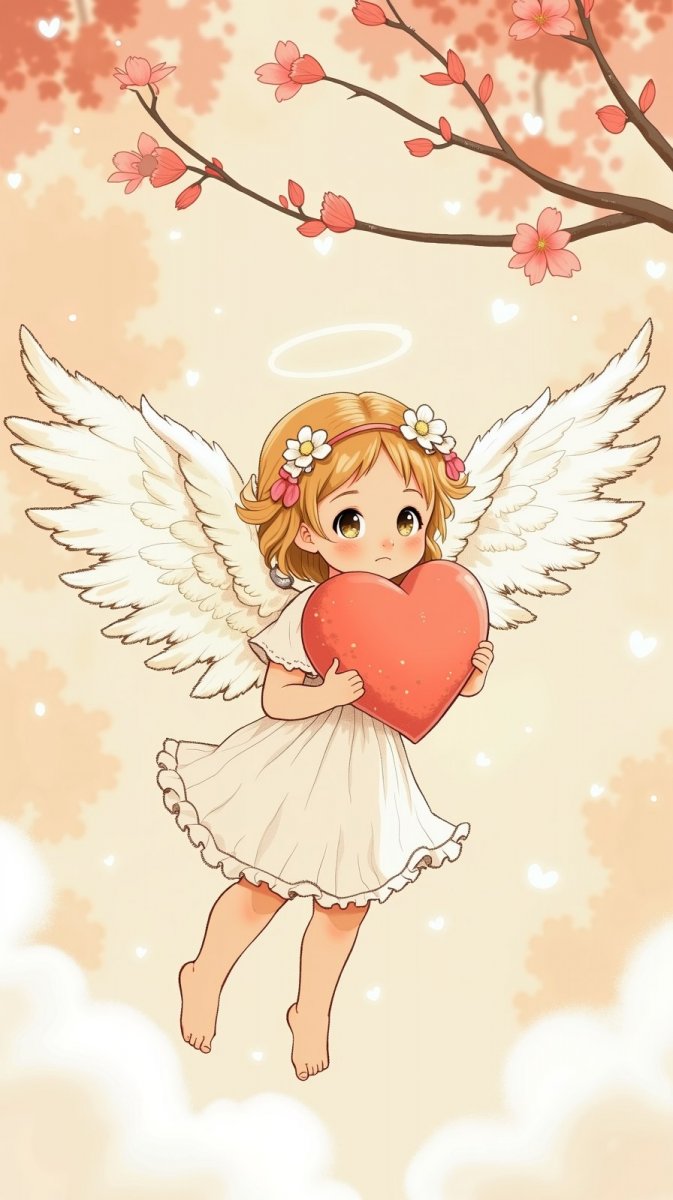#1 angel holding a heart, cute, romantic vibe, pastel colors, dreamy background, soft lighting, whimsical, illustration, ink drawing