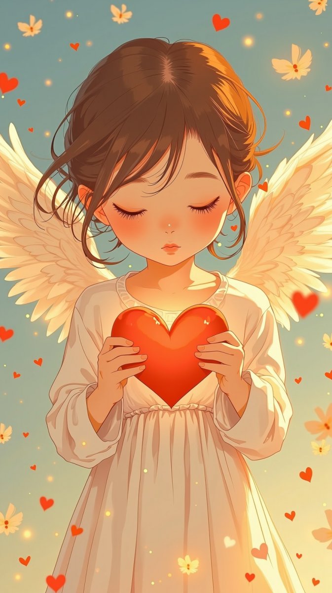 #5 angel tenderly holding a heart, warm and inviting atmosphere, aesthetic bliss, soft glows, loving gaze, pastel palette, illustration, ink drawing