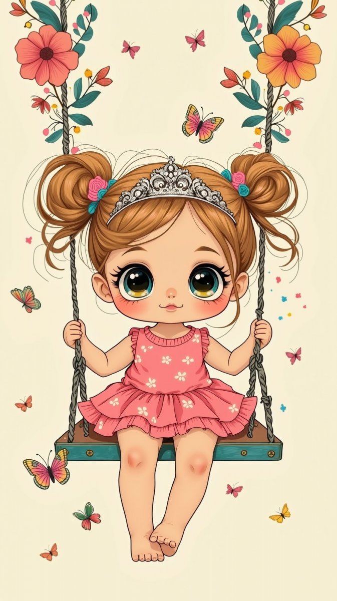 #5. naive art depiction of a doll with big eyes and pink outfit, adorned with a tiny silver tiara, sitting on a pastel-colored swing, surrounded by colorful butterflies and flowers, cheerful vibe #role_toys