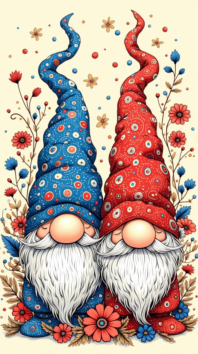 #3. zentagle doodling of two gnomes side by side, one in blue and the other in red, both having expressive round faces, wearing mismatched hats, surrounded by swirling patterns and floral motifs, playful design #role_toys
