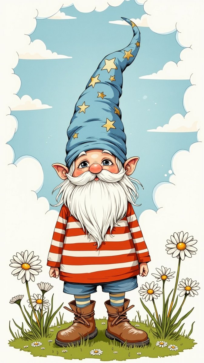 #1. ink drawing of a whimsical gnome wearing a sky-blue hat adorned with silver stars, standing on green grass with daisies around, features a long white beard, red and white striped shirt, and tiny brown boots, BG is a sunny sky with fluffy clouds #role_toys