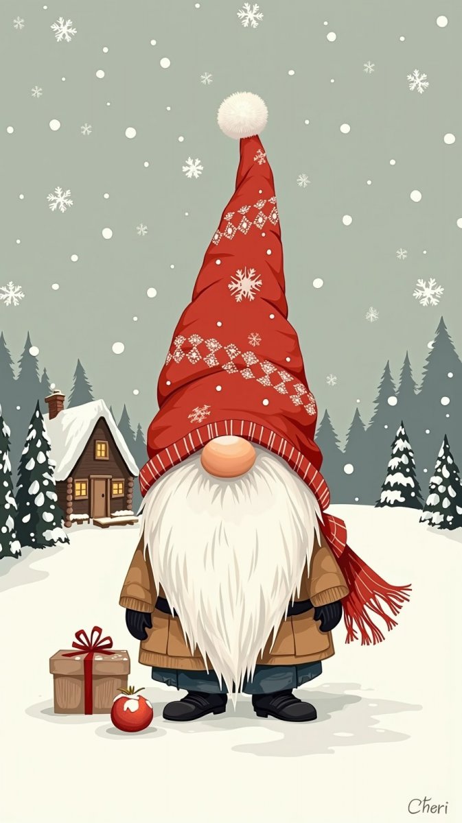 #5. doodling style illustration of a small holiday gnome, wearing a red and white checkered scarf, a tall pointed hat decorated with snowflakes, with a snowy landscape backdrop featuring twinkling stars above and a cozy cabin in the distance #role_toys