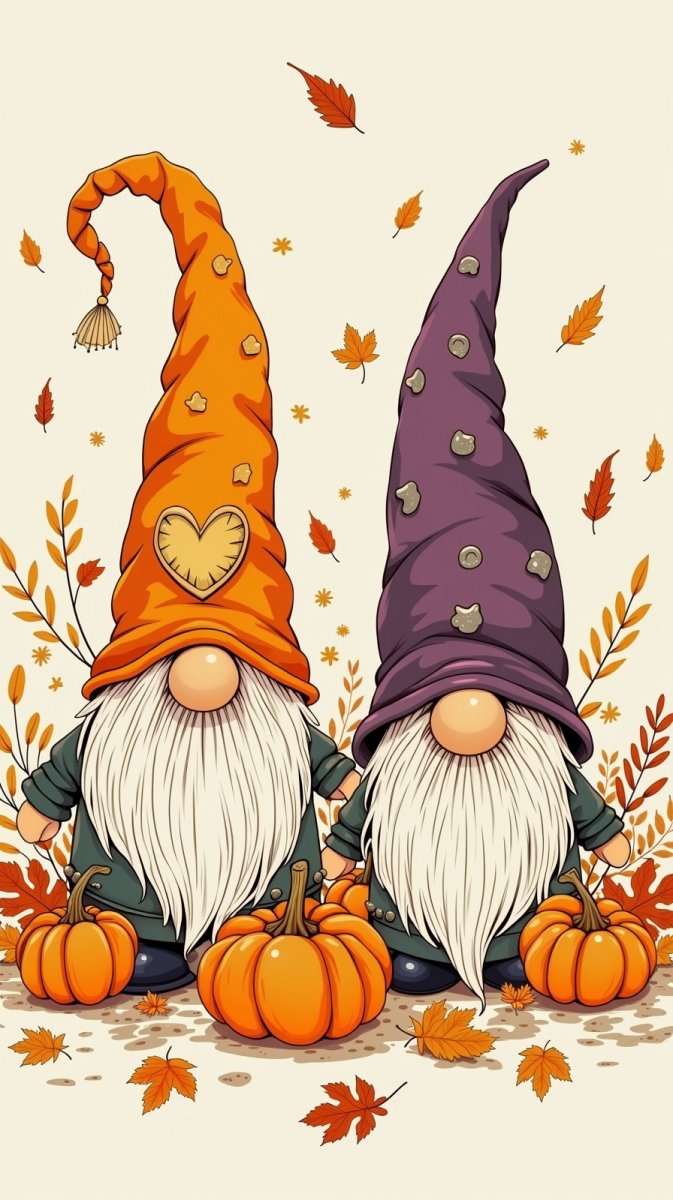 #3. folk art depiction of two gnomes, one wearing a bright orange hat with a golden heart while the other has a purple hat with silver stars, both with bushy tails and big noses, set against a backdrop of autumn leaves and pumpkins #role_toys