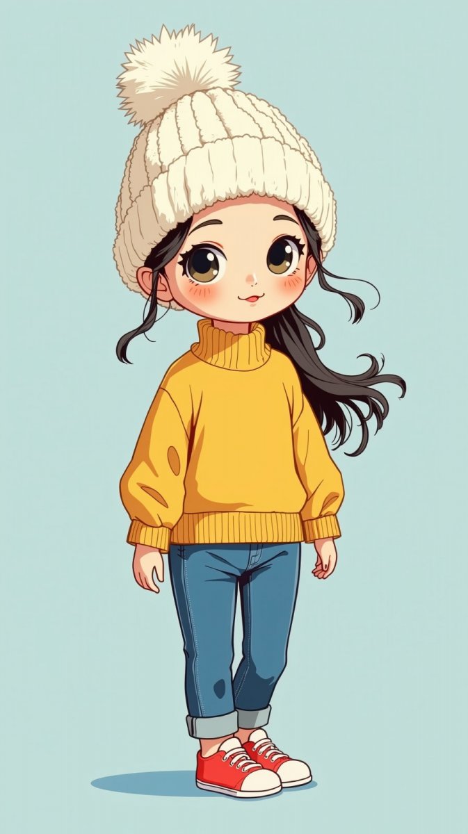 #4. cartoonish illustration of a doll in a cozy yellow sweater with a rounded neckline and a fluffy white pom-pom hat, paired with denim jeans and cute red sneakers, standing sideways with a big cheerful smile against a soft blue backdrop #role_toys