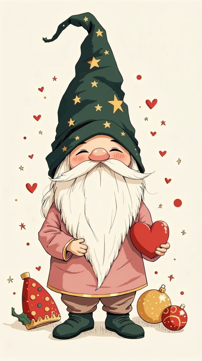#1. ink drawing of a gnome character with long white beard, wearing a dark green pointy hat with gold stars, body is soft pink fabric with gold trim, holding a small red heart, standing in a cheerful pose, background has festive ornaments scattered around #role_toys