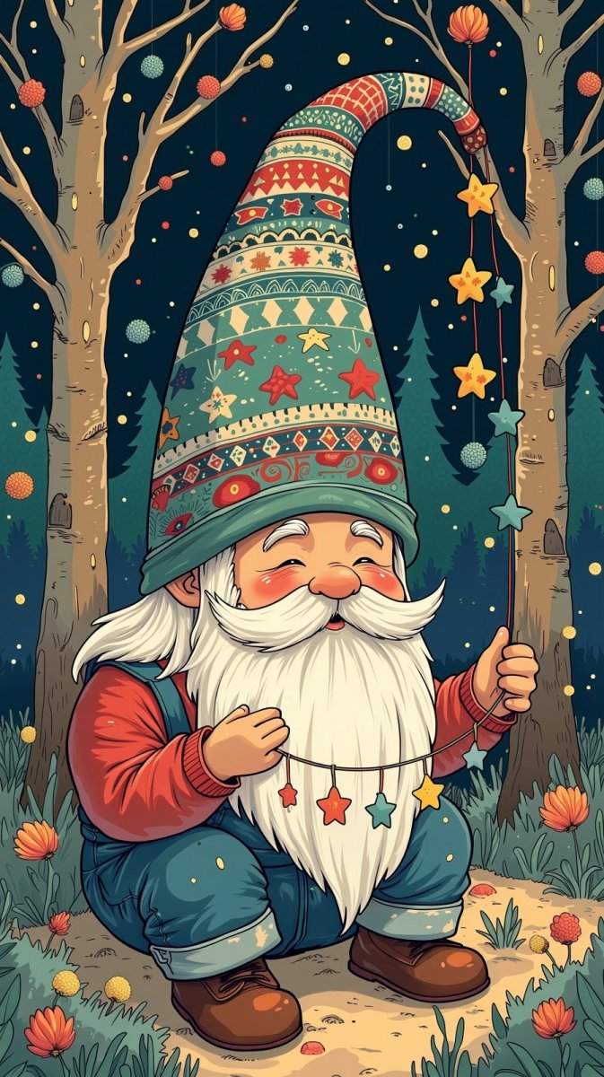#4. zentagle artwork featuring a gnome with a cone-shaped hat full of patterns, long white beard, wearing cute overalls and holding a string of colorful stars, sitting within a magical forest filled with whimsical trees and soft glowing lights #role_toys