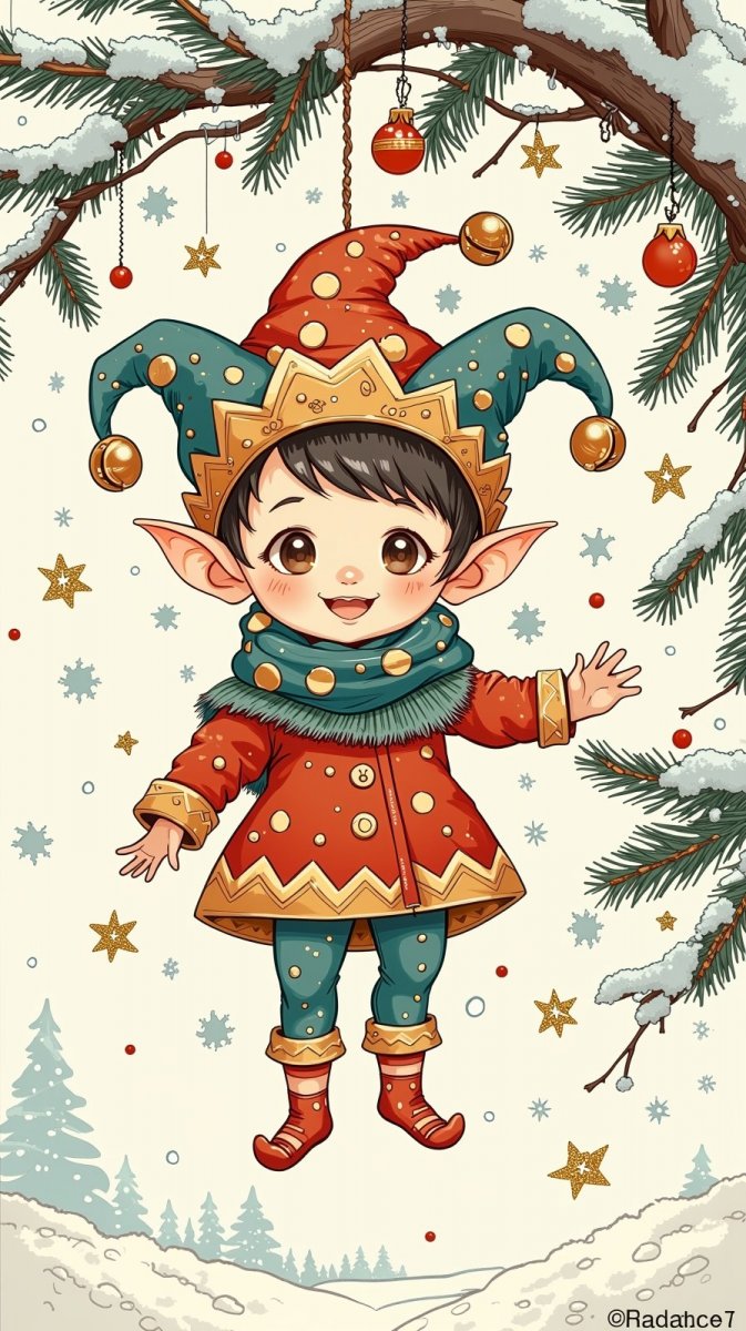 #5. doodling of a charming Christmas ornament shaped like a playful elf, suspended from a snowy branch, dressed in a vibrant outfit with large jester hats adorned with bells, background filled with festive decorations and swirling snowflakes #role_toys
