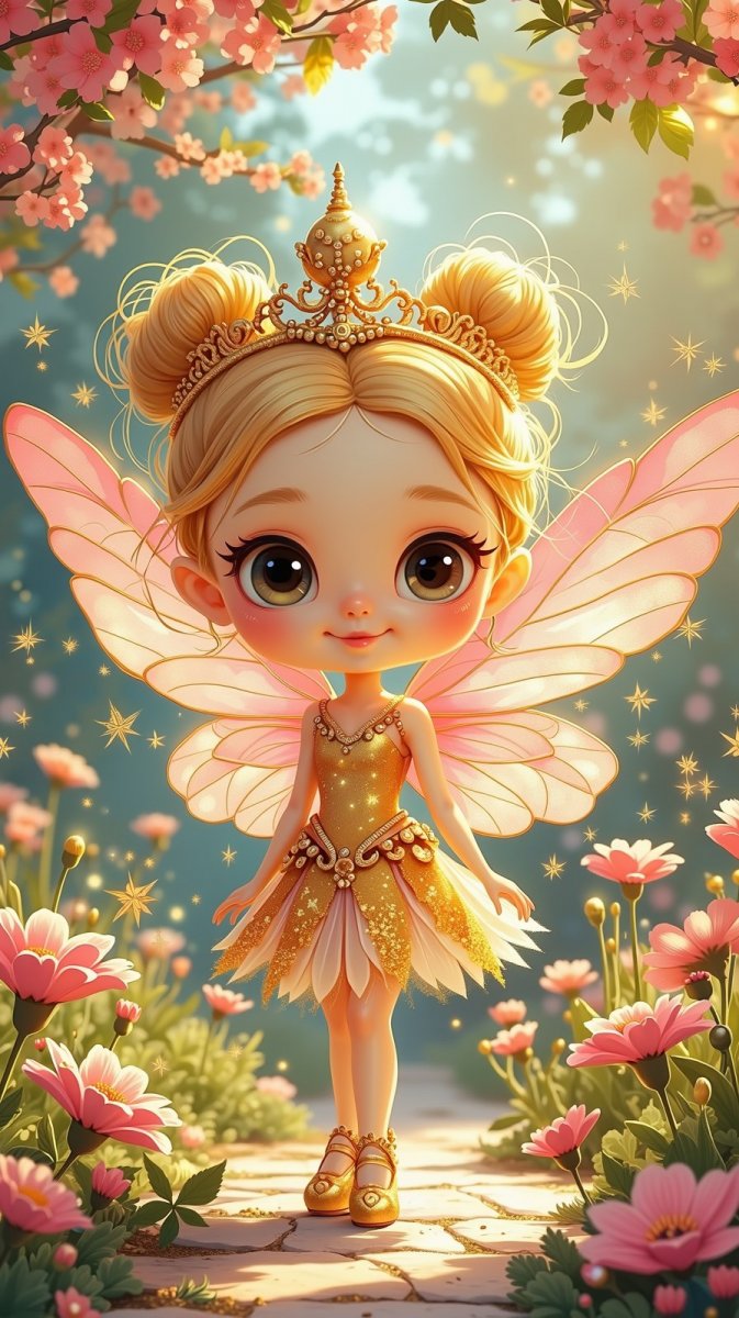 #3. cartoonish illustration of a fairy doll with pink and gold wings, playful expression on her round face, dressed in a shimmering gold gown, intricate detailing on shoes, standing in a garden of twinkling lights and blooming flowers #role_toys