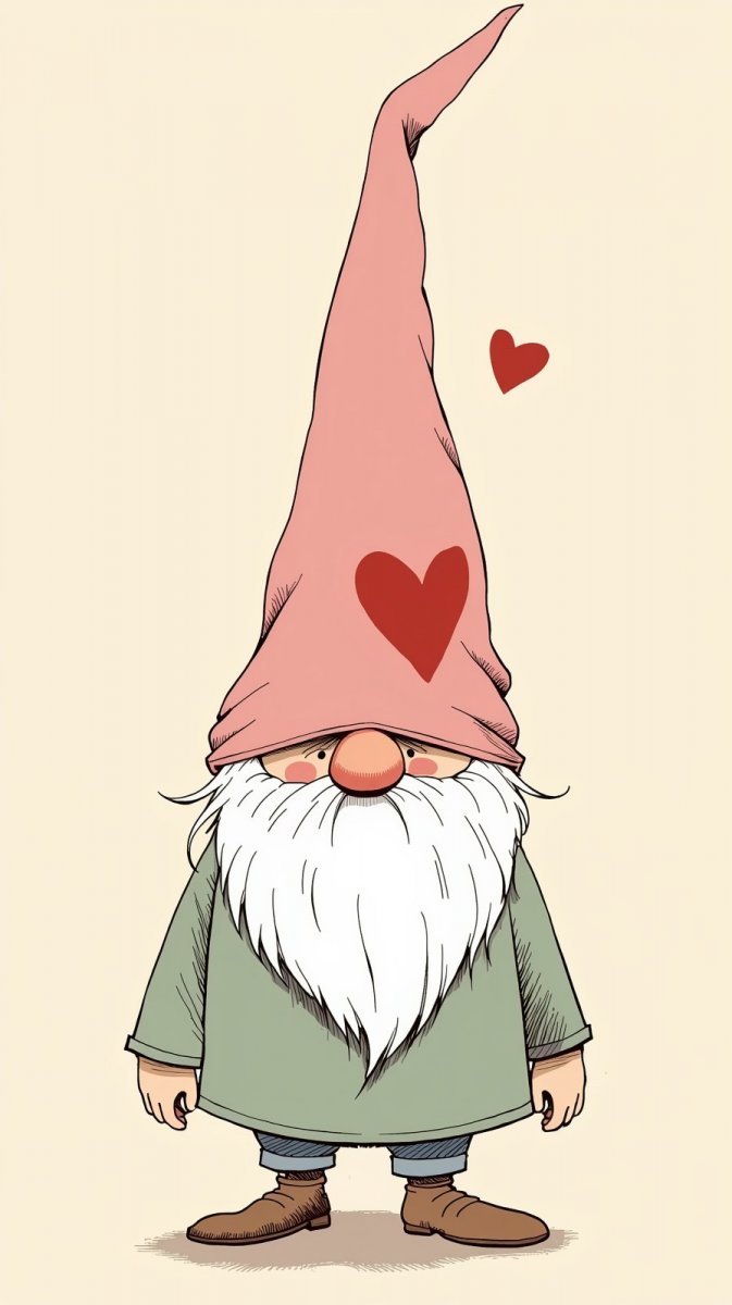 #1. ink drawing of small gnome figurine, wearing a long pointed pink hat with heart patch, white fluffy beard, and light green shirt, body made of soft material, standing with slightly bent legs and red nose, BG is neutral pastel color #role_toys