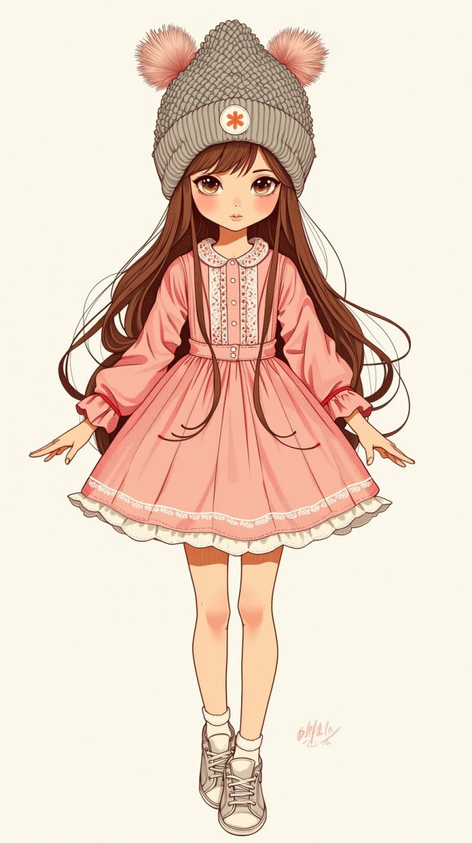 #3. folk art doodling of a doll with long brown hair, wearing a gray knitted hat with pom-poms, a pink dress with white lace, and cute white sneakers, posing with arms relaxed in a soft colored BG #role_toys