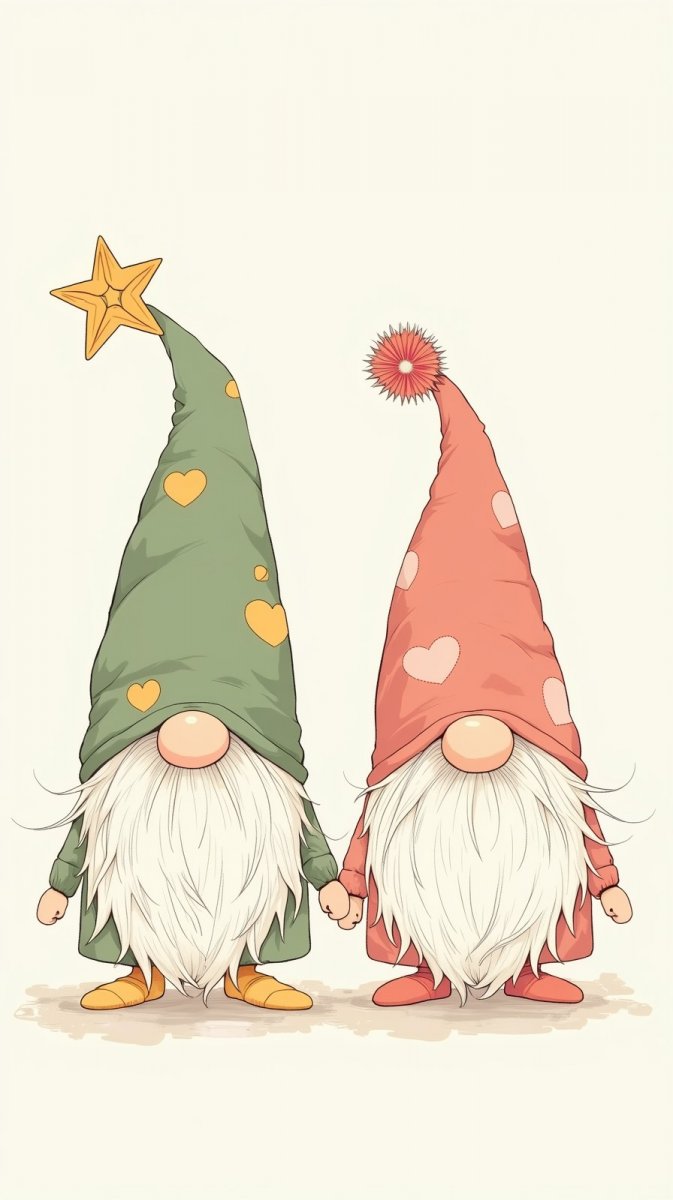 #2. zentagle illustration of two gnomes side by side, one in green with a star on the hat, the other in pink with heart accents, both having white hair and round faces, adorned with whimsical outfits, standing on a white background #role_toys