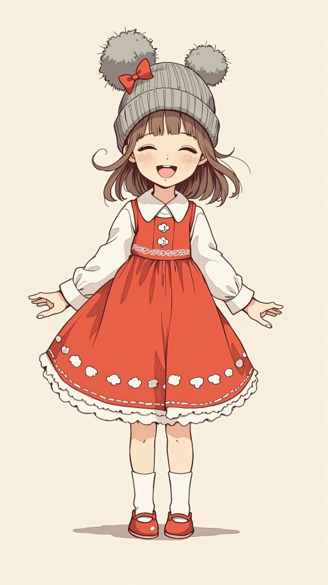 Радостная кукла в красном платье и серой шапке с помпонами: милый набросок - Картинка из нейросети Flux