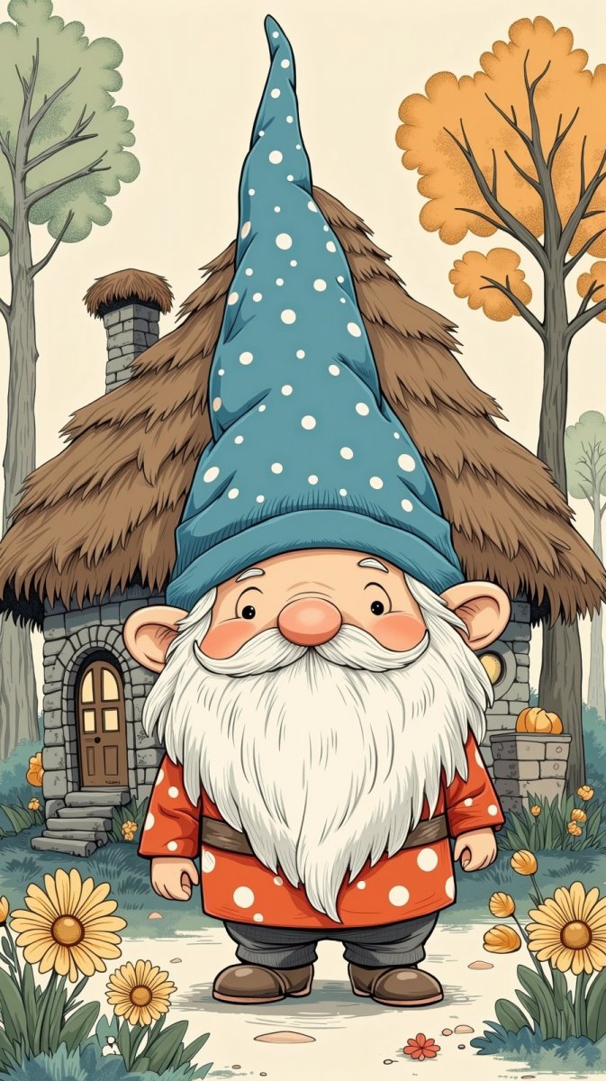 #2. zentagle illustration of a small gnome with a round face and cheerful expression, wearing a blue hat with polka dots, posed in front of a cozy cottage with a thatched roof, surrounded by whimsical trees #role_toys