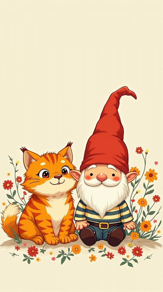 #2. cartoonish illustration of a small gnome with a striped shirt, cheerful expression, sitting beside a fluffy orange cat, both surrounded by colorful flowers #role_toys