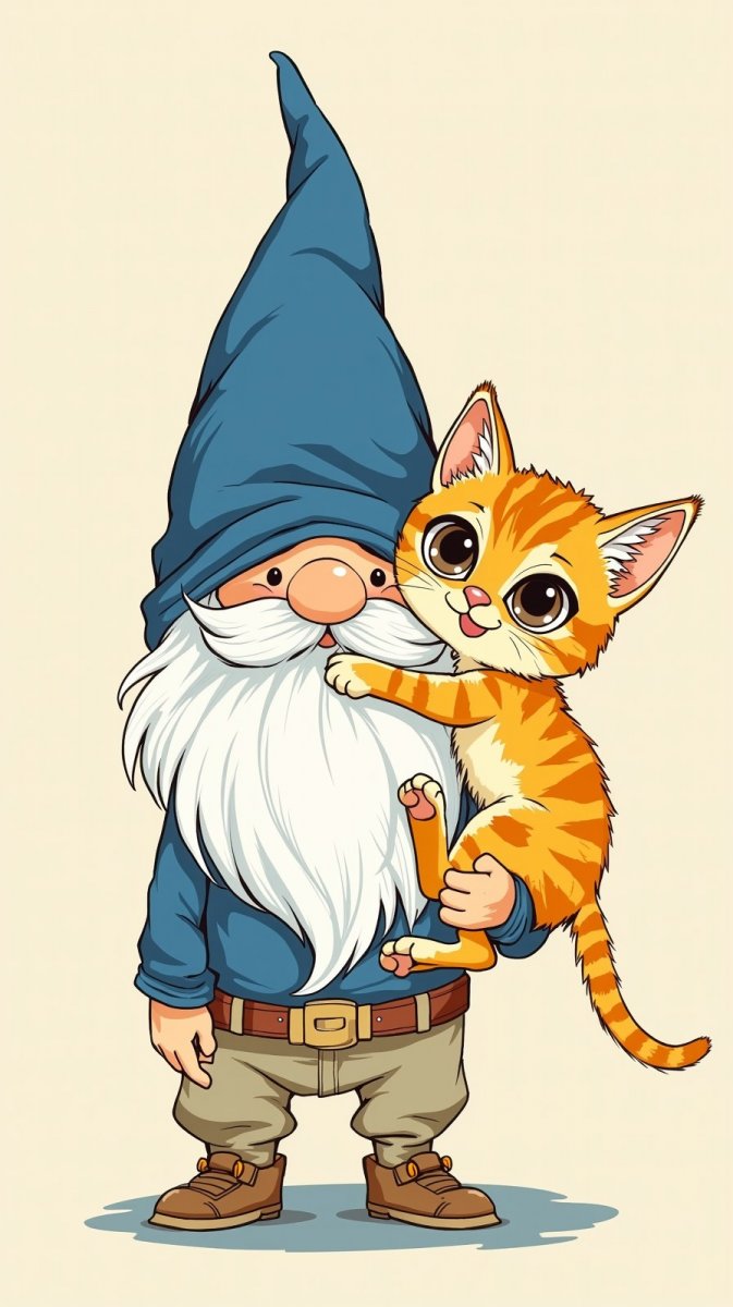 #1. ink drawing of a cute gnome with a blue pointed hat and white beard, holding a playful orange kitten with big eyes, background is a soft pastel color #role_toys