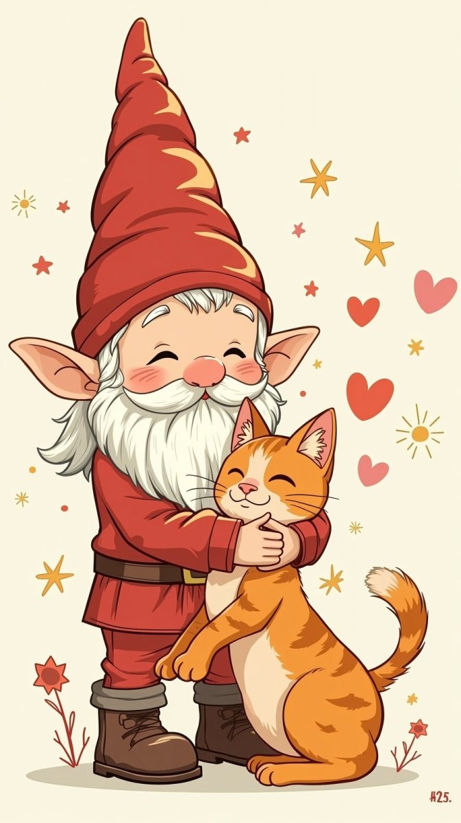 #5. doodling of a jolly gnome in a red outfit, gently hugging a cute orange kitten with a playful demeanor, stars and hearts scattered in the background #role_toys