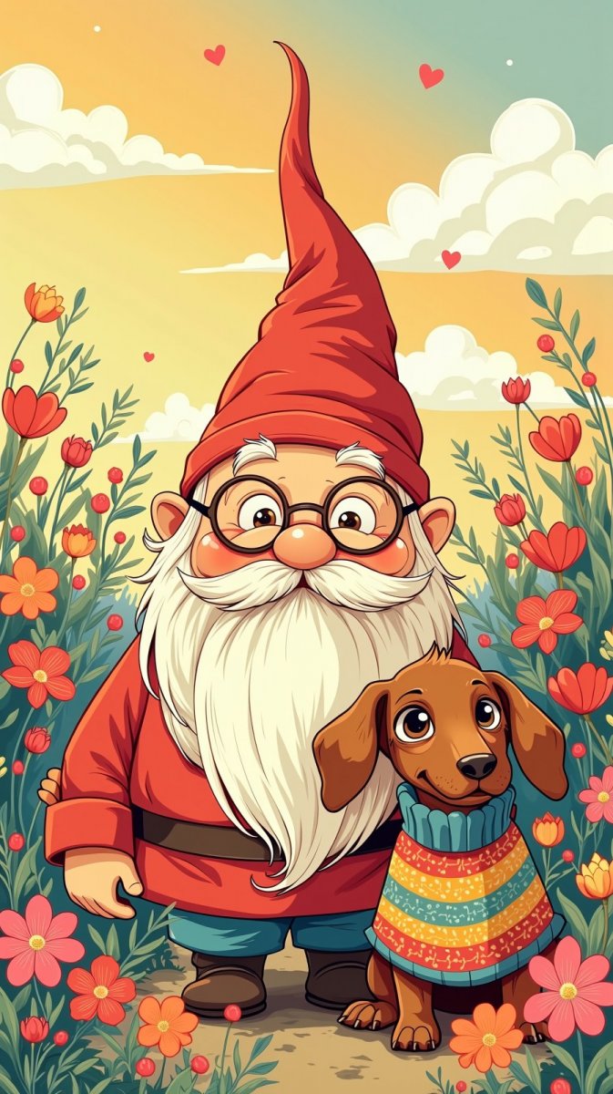 #2. cartoonish illustration of a round-faced gnome with a long white beard, wearing a red coat and tiny glasses, beside a jolly dachshund in a colorful sweater, backdrop of vibrant flowers and a sunny sky. #role_toys
