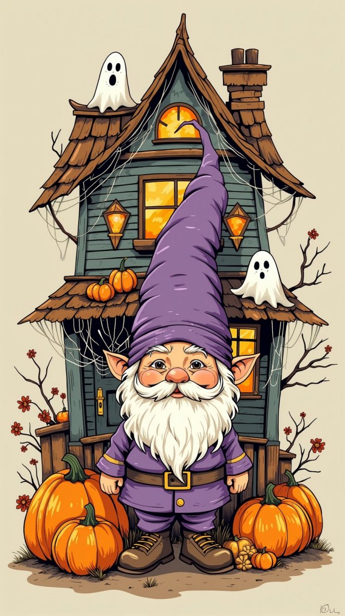 #3. folk art illustration of a cheerful gnome with a purple pointed hat, standing in front of a whimsical house decorated with cobwebs and ghosts, autumn pumpkins scattered around #role_toys