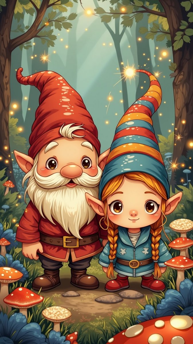 #3. cartoonish depiction of a boy gnome with a golden beard and playful eyes, paired with a girl gnome with two long braids wearing a colorful hat, surrounded by mushrooms and magical sparkles in a fantasy forest #role_toys