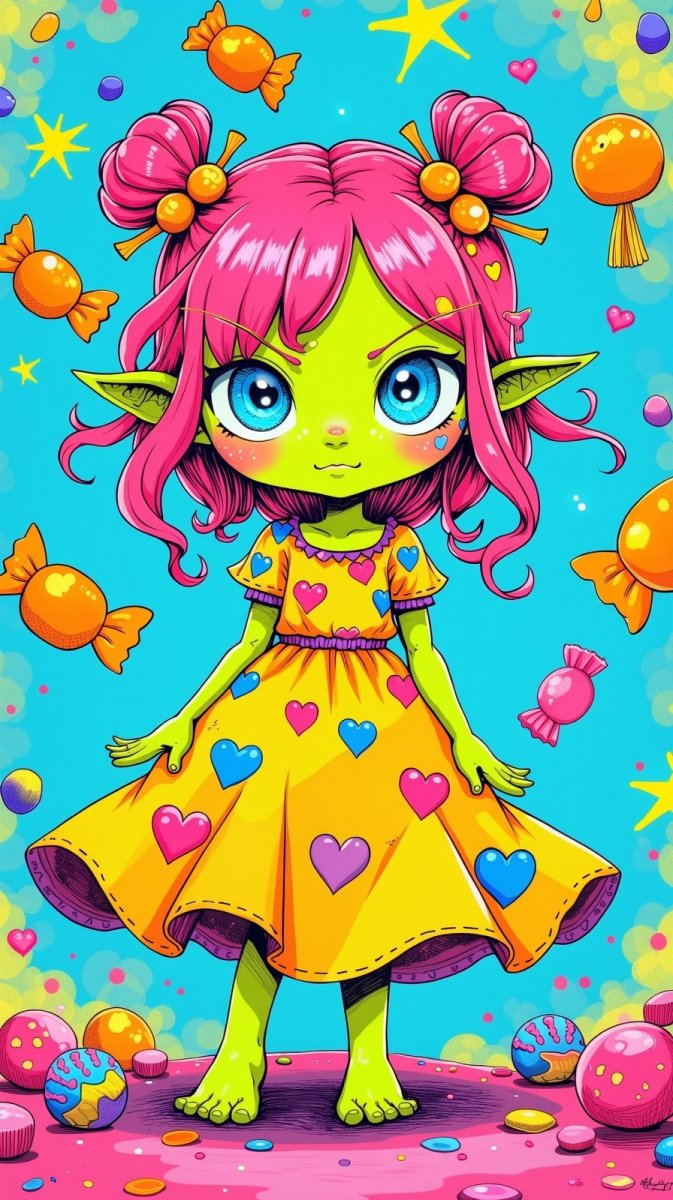 #1 illustration, ink drawing of a cute monster girl with neon pink and bright tangerine hair, wearing a colorful dress adorned with hearts and stars. Her bright cyan eyes sparkle with mischief, and she stands against a vivid blue and neon yellow background filled with floating candy. #sp_neon