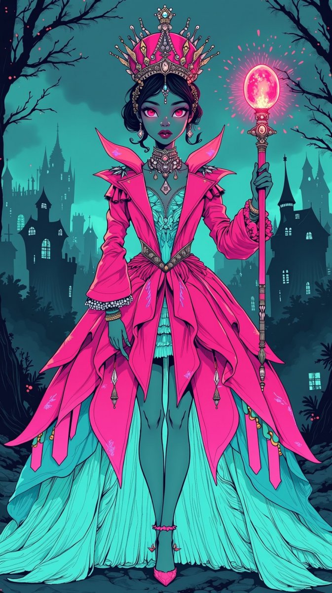 #4. illustration, ink drawing, a sophisticated gothic princess in fluorescent pink and neon aqua attire, adorned with jewels, holding a crystal-encrusted scepter, standing amidst a foggy scene filled with ethereal lights and shadowy outlines of castles, her expression regal and striking, high detail, stunning visuals #sp_neon