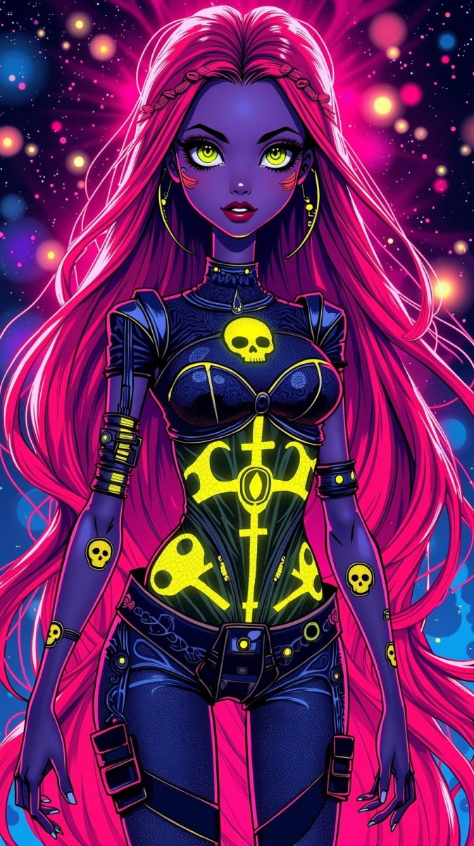 #2. illustration, ink drawing, a dramatic full-body portrait of a stunning monster high doll in radiant magenta and luminous lime colors, with long flowing hair and a gothic outfit adorned with skull patterns, her dark makeup contrasting sharply against her bright features, the background illuminated with neon effects and swirling lights, vibrant colors, perfect composition #sp_neon