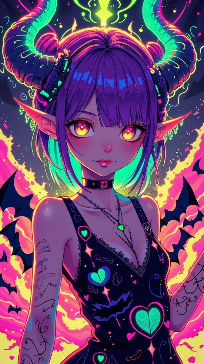 #3. illustration, ink drawing, an enchanting demon girl with electric purple and neon green hair, showcasing her captivating eyes and devilish smile, donned in a dress decorated with glowing hearts and bat motifs, enveloped by a colorful aura, background featuring vivid designs and high-energy lighting #sp_neon
