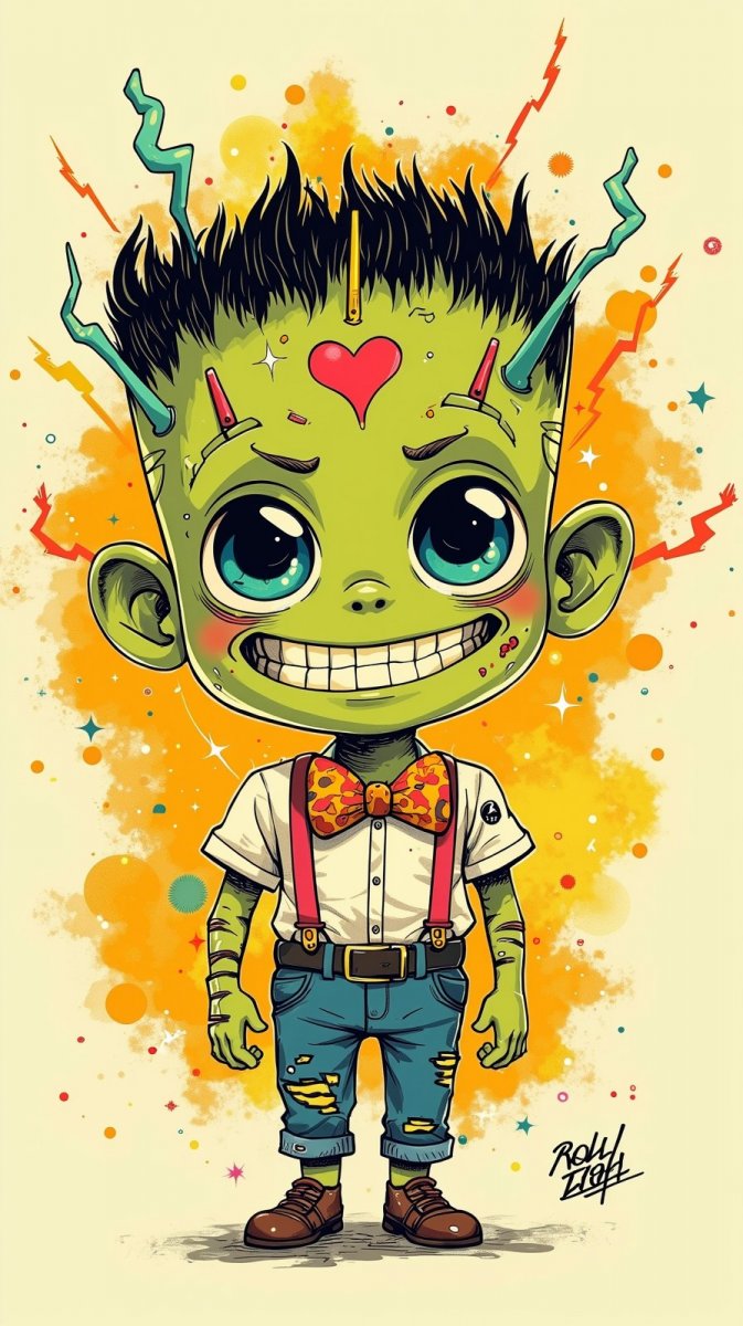 Очаровательный и забавный персонаж в духе классического монстра Франкенштейна, но с неожиданной милой деталью – сердцевидным выступом на лбу. Он излучает позитив и радость, демонстрируя счастливую улыбку и острые зубки, которые добавляют ему игривости. Яркий и красочный образ дополнен стильным разноцветным галстуком-бабочкой и задорными подтяжками, подчеркивающими его индивидуальность. Вокруг него порхают анимированные молнии, создавая ощущение волшебства и энергии. Все это разворачивается на фоне светящегося фона с блестками, что добавляет картине сказочности и легкости. Рисунок выполнен в технике чернильной живописи, что придает ему особую выразительность и глубину. Этот персонаж идеально подойдет для иллюстрации к детской книге или комиксу, а также станет отличным украшением для тематической продукции, вдохновленной миром Monster High. Он сочетает в себе элементы классического хоррора и современной поп-культуры, создавая уникальный и запоминающийся образ, который наверняка вызовет улыбку у зрителя любого возраста. Его добродушный взгляд и веселая поза обещают множество приключений и позитивных эмоций, делая его настоящим символом радости и беззаботности
