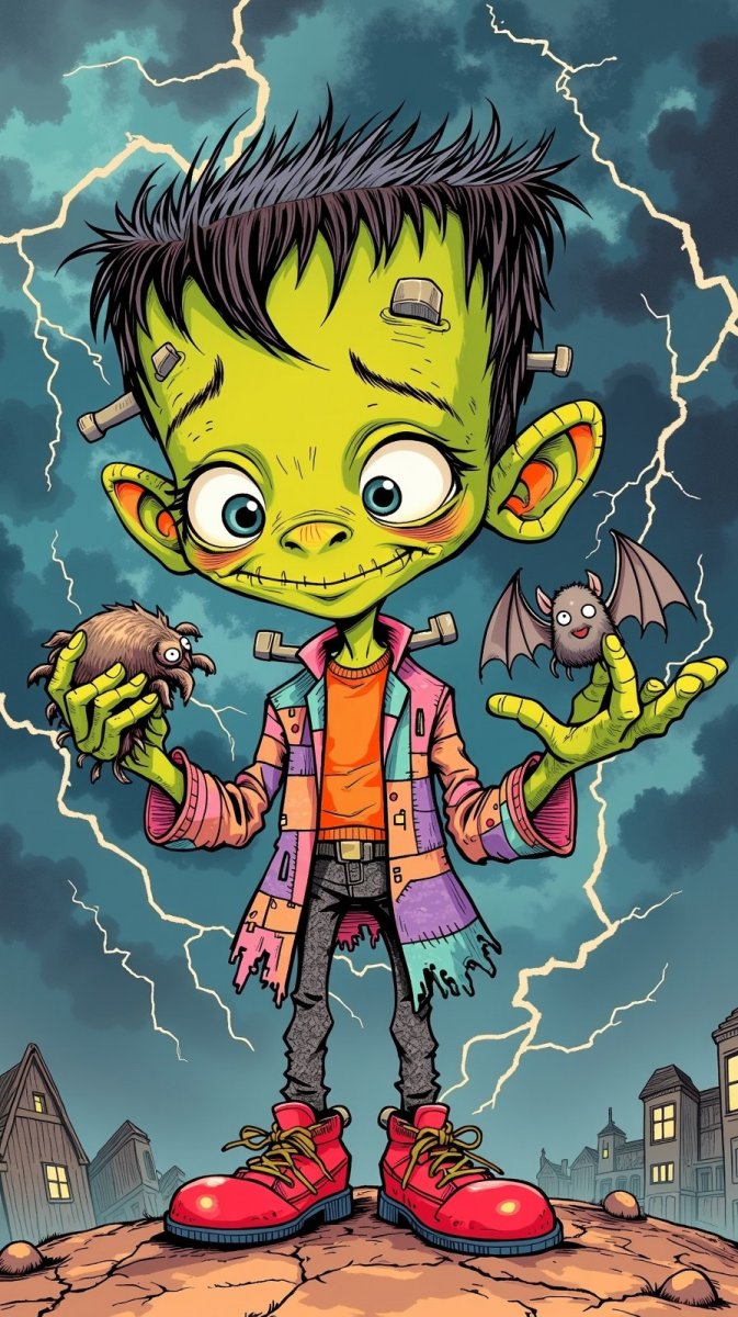 #1. illustration, ink drawing of a cute and funny frankenstein monster character with big eyes, colorful mismatched clothing, holding a small pet bat, quirky expression, in a cartoon style, background featuring lightning and dark clouds, vivid colors, charming details, by Tim Burton, by Alex Pardee #role_monster_high