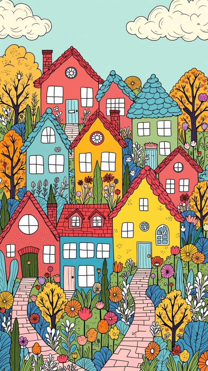 #3. zentangle doodling of cute houses painted in vibrant colors, showcasing a mix of shapes and sizes, with detailed gardens surrounding each dwelling, under a dreamy pastel sky #role_houses