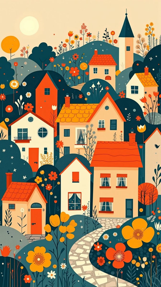 #4. naive art depiction of charming homes in bold colors, some tall and slender, while others are wide and cozy, set against a lush backdrop of blooming flowers #role_houses