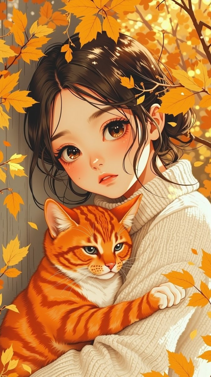 Осенняя нежность: девушка с кошкой в золотом листопаде - Генерация в нейросети Flux.1
