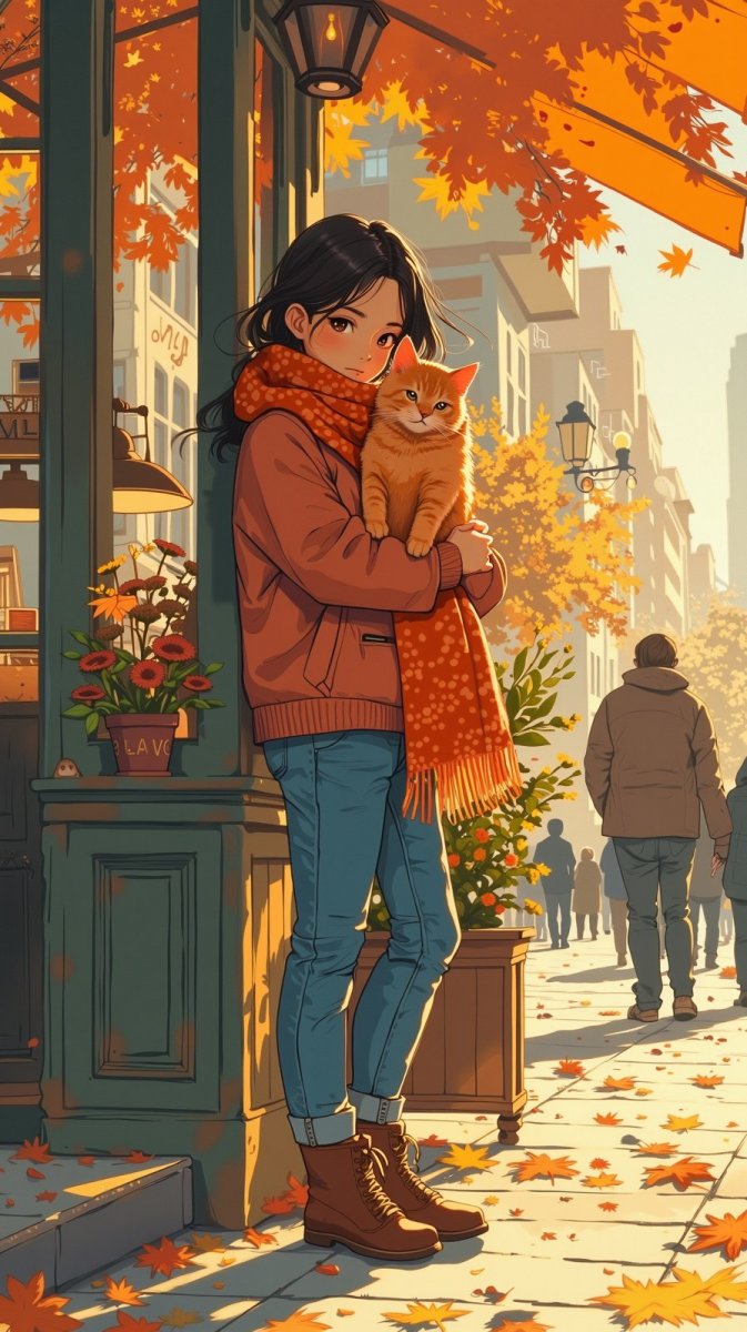 #4. осень в городе, девушка с рыжим котиком на руках, уютная кофейня, джинсы и яркий шарф, теплые оттенки, романтичная обстановка, двойная экспозиция #role_autumn